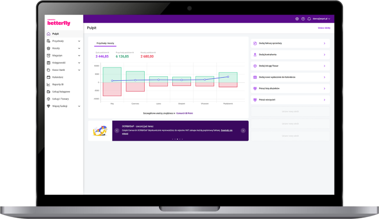 Comarch Betterfly to program do zarządzania firmą integrujący i automatyzujący najważniejsze procesy związane z prowadzeniem biznesu. Obsługa sprzedaży stacjonarnej i internetowej płynnie łączy się z wystawianiem faktur online, księgowością i magazynem. Technologia oparta o sztuczną inteligencję pozwala na wprowadzanie do systemu dokumentów za pomocą zdjęć, a raportowanie umożliwia analizę wyników firmy. To wszystko dostępne z każdego miejsca dzięki bezpiecznej, polskiej chmurze Comarch i aplikacji mobilnej.